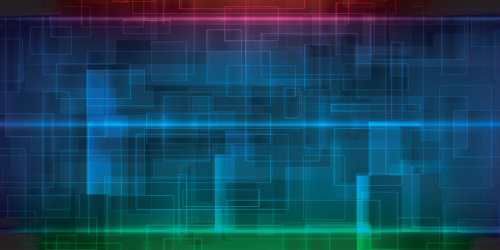 Vector illustration of futuristic abstract blue technology background with horizontal red green and blue neon lighting on complex future tech grid line patterns.