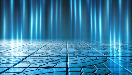 Blue neon stream. High tech abstract curve tunnel background. Striped creative texture. Information transfer in a cyberspace. Rays of light in motion.