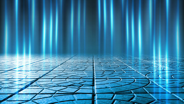 A futuristic tunnel with glowing blue neon lights and geometric patterns