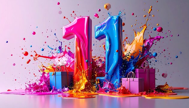 Vibrant pink and blue number eleven figures stand on gift boxes, surrounded by colorful paint splashes and drips.