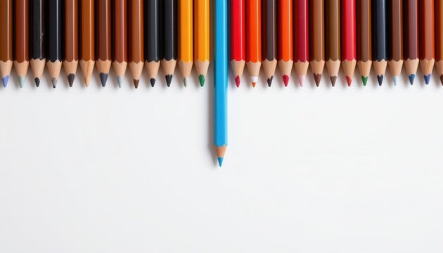 Colorful Collection of Pencils with a Single Blue Pencil Standing Out on a White Background