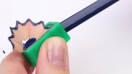 Sharpening a pencil with a green sharpener. Close-up of a hand holding a blue pencil.