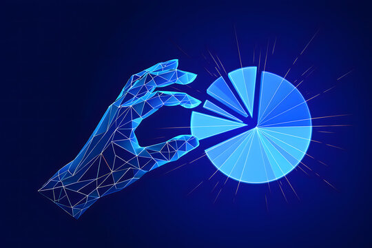 A polygonal hand taking a slice from a blue pie chart on a dark blue gradient background design element