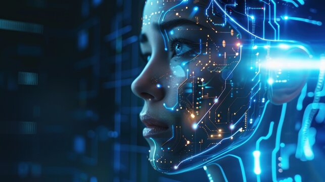 Female face with glowing blue lines, Artificial intelligence concept. AI generated