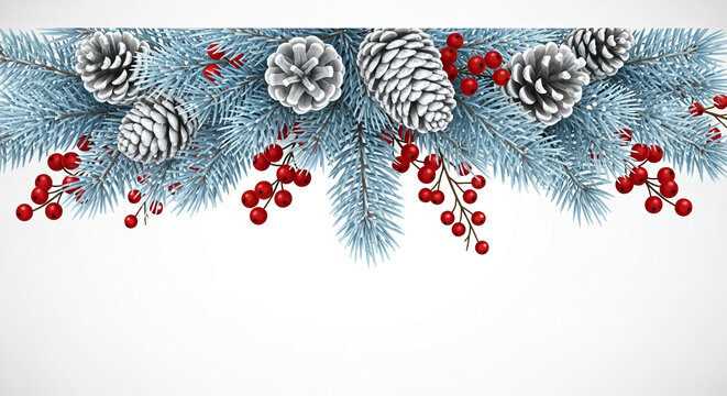 Christmas holiday tree. Border snow background. Snowflakes. Blue spruce, beautiful Christmas and New Year Xmas tree art design, abstract blue widescreen backdrop, asian style. White tone