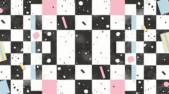 Abstract geometric background of pastel pink, yellow and blue squares.