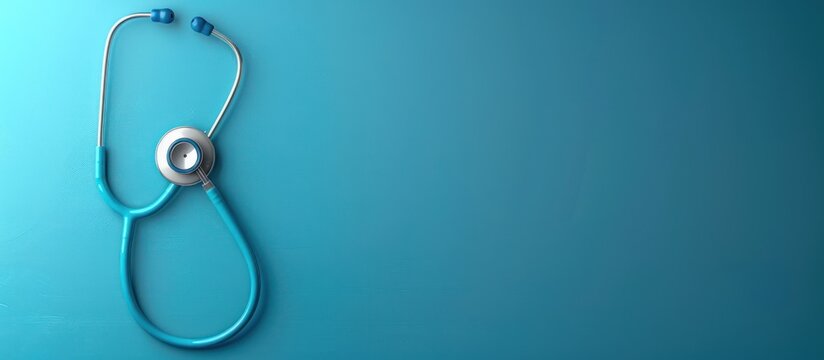 Close-up of a blue stethoscope on a white desk in a medical office with blurred background.