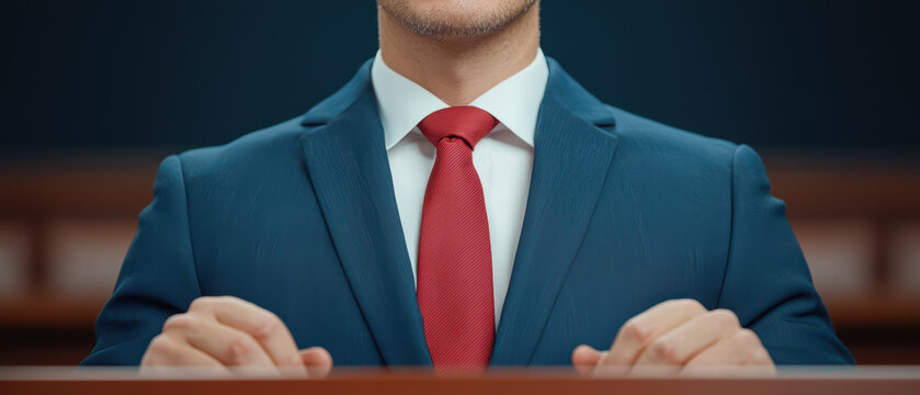 professional attorney in blue suit and red tie presenting case in court, showcasing confidence and authority