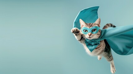 Orange cat dressed as a superhero, flying with a blue mask and cape against a turquoise background. Adorable feline in a dynamic pose, resembling a comic book hero