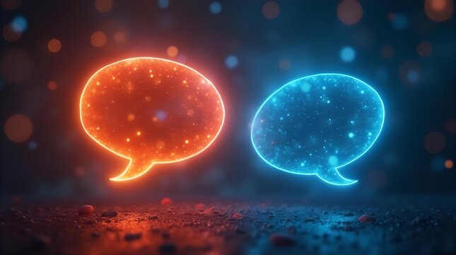 Two glowing neon speech bubbles, one red and one blue, symbolize digital communication, online chat, and AI dialogue, set on a dark background with vibrant bokeh lights.