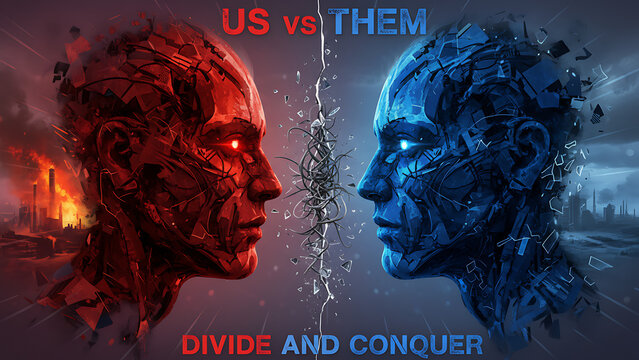 Two faces in red and blue symbolize political polarization and social division 30609856 1