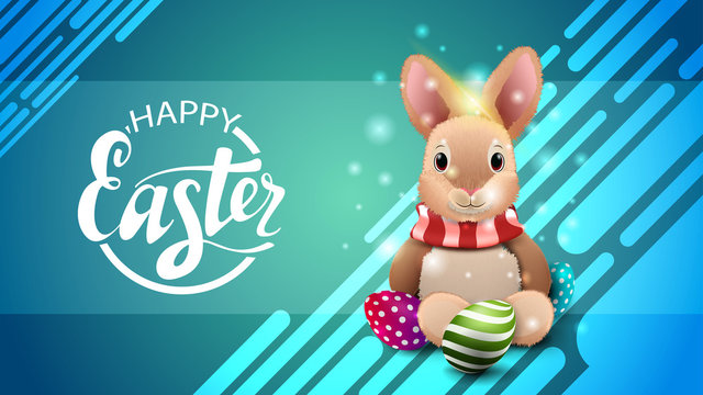 Happy Easter, horizontal modern blue template postcard with Easter bunny