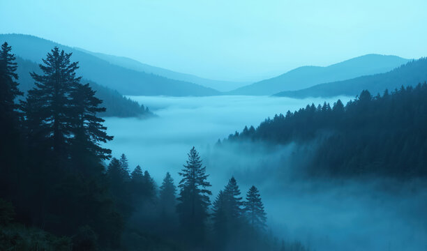 Misty blue toned forest scene at dawn with tall evergreen trees. Fog covers ground in this serene, mystical landscape. Mountainous terrain with dense pine woods creates tranquil, atmospheric view.