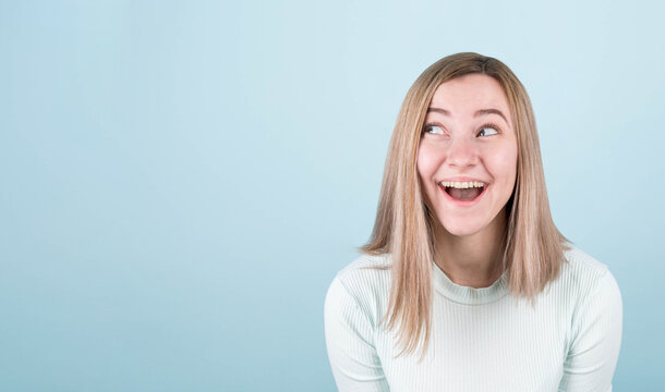 Beautiful young woman with bare shoulders with a beautiful professional evening make-up and hairstyle in a blue top with ruffles.