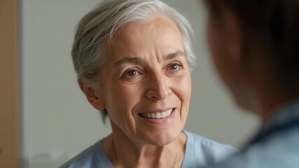 Receiving eye contact senior woman smiling tilting holding gaze for caregiver in clinic blue top