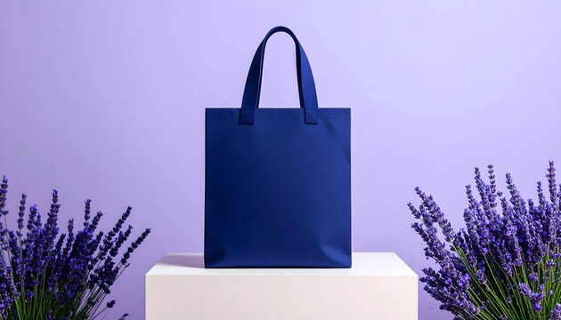 A vibrant blue tote bag stands elegantly on a platform, adorned with sprigs of lavender and a background of a soft, gradient purple. A tote bag placed on a podium in studio setting.