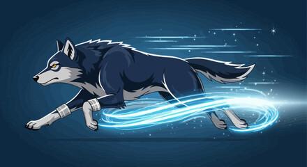 Energetic wolf illustration with glowing blue trails symbolizing speed and power
