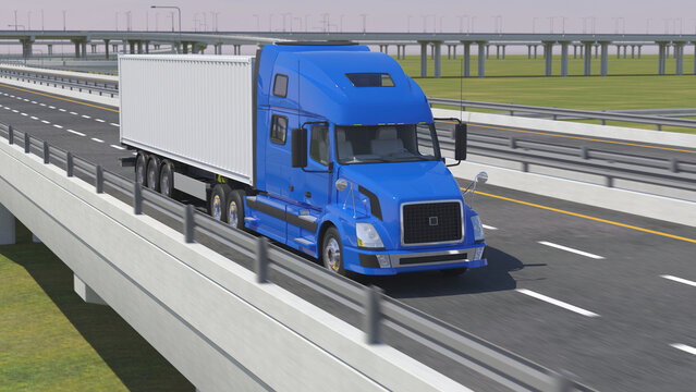 Blue truck on a highway in a desert landscape. Scenic view with blue sky and clouds. Useful for transportation, travel, and logistics themes. Ideal for commercial and editorial use. Generative AI