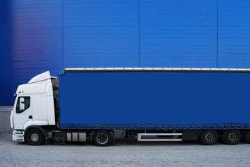 Banner with side view of a blue truck, for adding custom ads. Cargo transportation concept. Copy space. Isolated on dark background. 3d illustration.