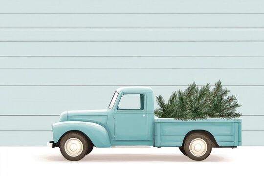 A vintage blue truck carries a load of evergreen trees against a simple, light-colored background.