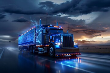 Futuristic blue truck on highway with digital graphics illustrating advanced technology