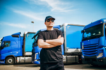 Smiling truck repair shop owner in a workshop. Mechanic man with crossed arms looks at camera. Positive male at work, auto industry, blue truck behind. Portrait of worker, vehicle repair.