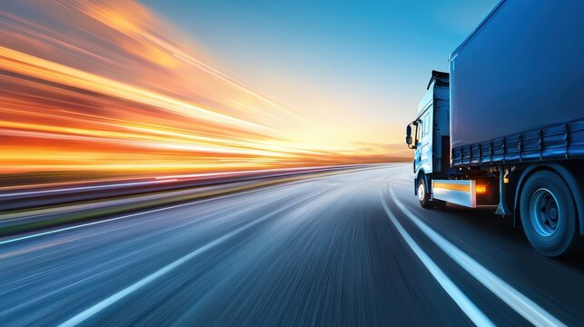 A blue truck driving fast on a highway during a vibrant sunset, showcasing motion and speed.
