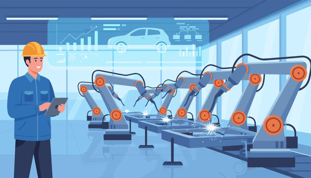 A smiling engineer in a hard hat and blue uniform uses a tablet to monitor a futuristic car manufacturing assembly line where robotic arms perform precise welding operations, showcasing advanced