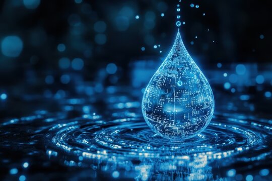 Digital blue water drop icon with binary code, artificial intelligence in water resource management, hydrology modeling, environmental monitoring, analysis for sustainable conservation efforts
