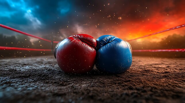 Red and blue boxing gloves colliding with golden light burst and dust on dark background
