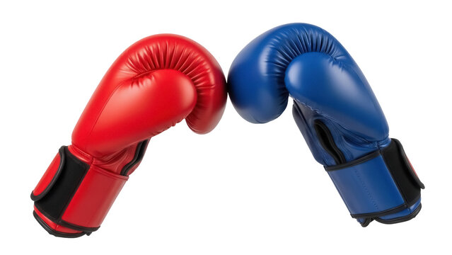 Red and blue boxing gloves facing each other, sport equipment, punching protection, sparring gear, fight club isolated on transparent background