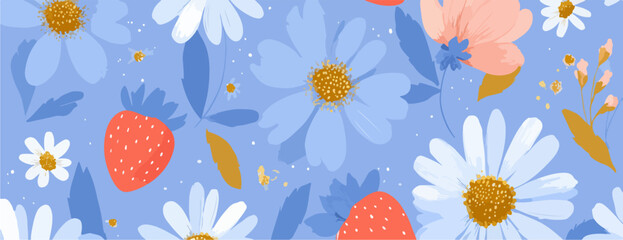 파란 배경 위에 활짝 핀 데이지 꽃과 싱싱한 딸기가 조화롭게 어우러진 사랑스러운 분위기의 이음매 없는 패턴 디자인.