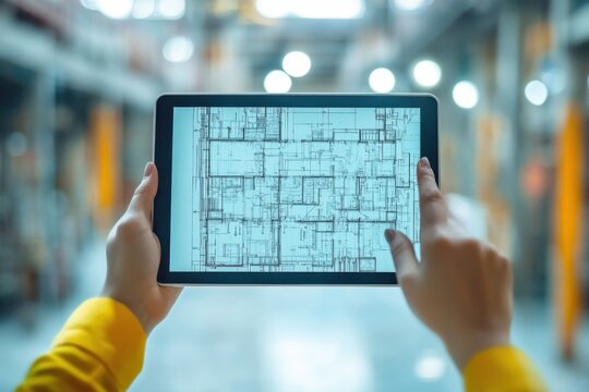 Constructing the future architectural plans on tablet in industrial warehouse digital blueprinting innovative design