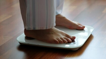 Top view crop faceless barefoot female in cozy pajama standing on digital weight and body fat scales with display showing healthy weight of 60 kg on bathroom floor in morning
