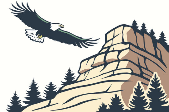 Eagle flying above sandstone bluffs at Garden of the Gods Illinois with pine trees below, modern flat illustration style