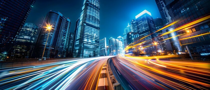 Lights trail at night city landscape. Low shutter speed cityscape photography.