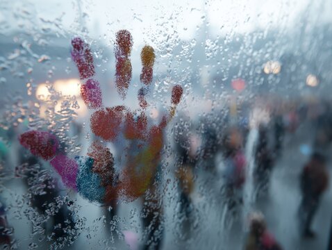 single handprint fades on rain covered window, evoking sense of mystery and solitude. blurred background suggests rainy day, enhancing reflective mood