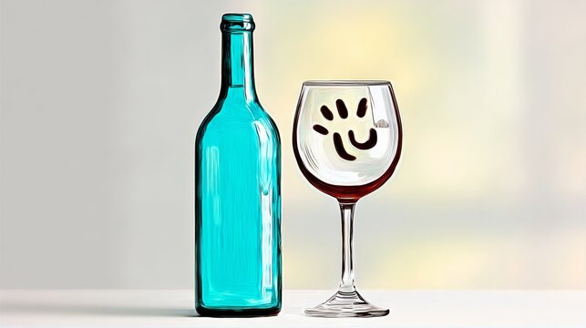 Vibrant blue glass bottle beside elegant wine glass with playful handprint design, showcasing a creative beverage presentation in a soft, blurred background, perfect for artistic and culinary themes