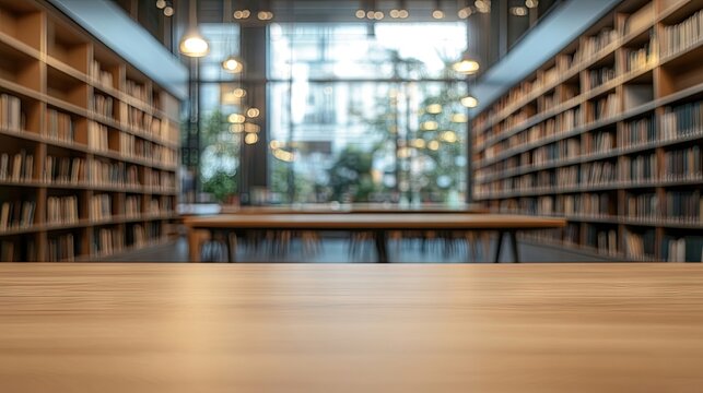Empty wood table top with blur background of library at school or university. The table giving copy space for placing advertising product on the table along with beautiful library book background.