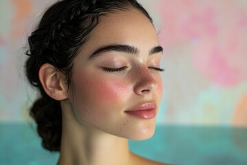 This image showcases a woman with a serene expression, her eyes gently closed, and a subtle blush highlighting her cheeks The soft lighting enhances the natural beauty of her skin, complemented by a