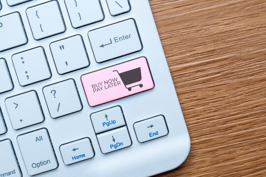 A keyboard key labeled "BUY NOW PAY LATER" with a shopping cart icon. Installment payment options in e-commerce and online shopping concept.