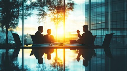 Strategic Summit: Silhouetted figures of a corporate boardroom meeting against a cityscape backdrop, conveying a sense of serious deliberation and powerful decision-making.