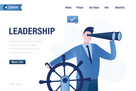 Business leadership, landing page template. Visionary to lead company success, work achievement. smart businessman uses spyglass, boat captain controlling steering wheel.