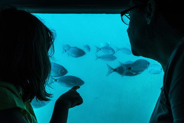 Mother and daughter looking at fish through a glass in a boat