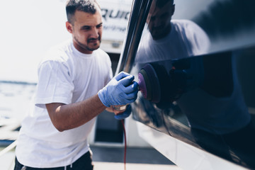 Boat maintenance - Man with orbital polisher polishing boat in marina. Selective focus.
