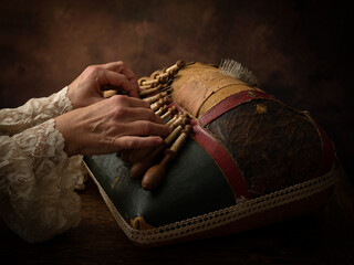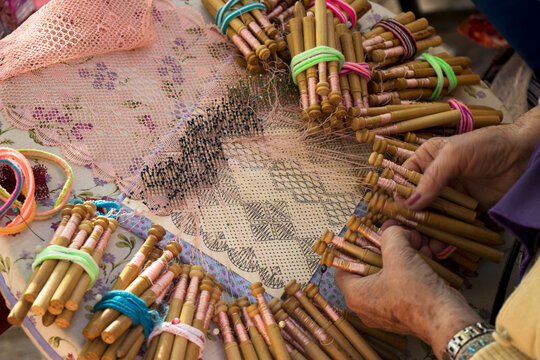 Detail of the hands of a traditional bobbin lacemaker performing her craft.