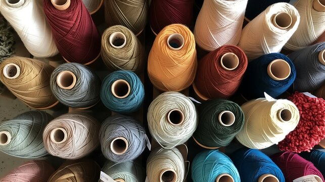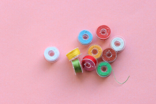 Threads in reels. Colored bobbins for embroidery knitting hobby accessories creativity.