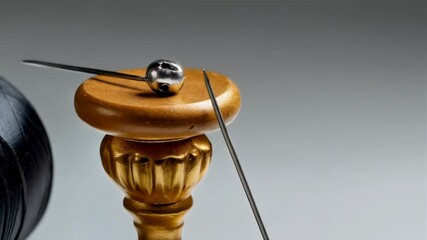 Needles with decorative holders and large spool of black thread, vintage sewing equipment, craft materials, needlework closeup