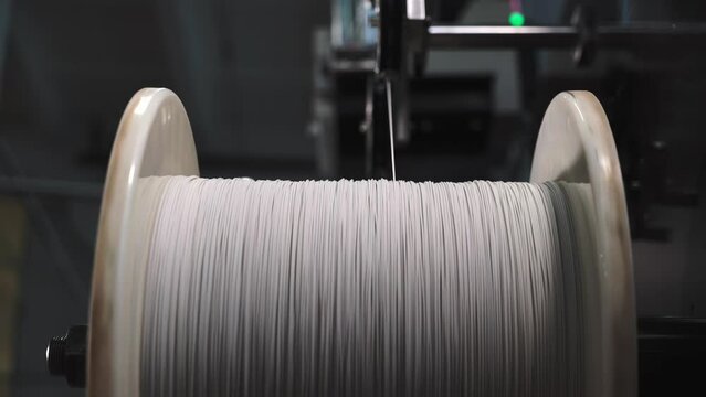 Steel wire coils at factory. Rotating and reeling metal threads bobbins