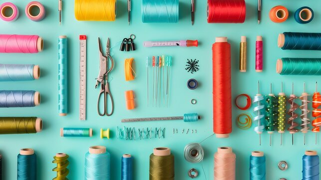 A flat lay of sewing machine accessories including bobbins, needles, and thread arranged on a sewing table